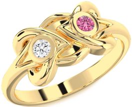 Crafted in polished yellow gold, this romantic promise ring features two bezel-set round stones—one fiery red and one brilliant white—symbolizing passion and purity. The sculpted, interwoven gold setting forms a fluid, almost floral design, representing harmony and everlasting love. Elegant and timeless, this piece is a beautiful way to express a heartfelt bond and lifelong commitment.