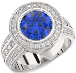 Diamond Blue Sapphire Platinum Round Halo Pave Engagement Ring