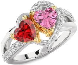 This elegant Promise Ring features two stunning heart-shaped stones set in a polished yellow gold band. Surrounding each gemstone is a sweeping arc of round-cut diamonds, adding radiant shimmer. The split-shank design offers a modern twist, while the dual-heart motif symbolizes love, connection, and unity. A perfect expression of romance and timeless elegance.