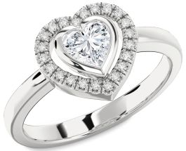 Gracefully refined, this engagement ring features a radiant heart at the center, framed by a luminous halo that mirrors its delicate contour. The classic silhouette is elevated by its elegant symmetry and shimmering presence, creating a look that’s both heartfelt and timeless. A perfect expression of love, this ring speaks to promises made and a future beautifully shared.