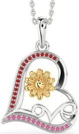 Ruby & Pink Sapphire White Yellow Gold Heart Flower Necklace
