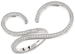 Modern and expressive, this statement ring flows with sculptural elegance, featuring two bold curls that meet in a rhythmic swirl. Lined with radiant accents that trace every contour, the design evokes movement, creativity, and individuality. A celebration of free-spirited beauty and confident charm, this piece transforms contemporary form into a striking symbol of love’s unique journey.