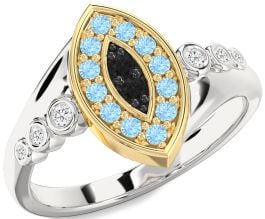Black Diamond & Aquamarine Silver & 10K gold Evil Eye Ring