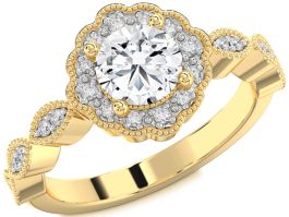 Inspired by vintage romance, this engagement ring features a dazzling center stone framed by a scalloped halo of shimmering accents. The band continues the delicate detail with alternating marquise-shaped clusters, each edged in milgrain for added charm. Graceful and enchanting, this design captures timeless elegance with a whimsical touch of floral artistry.