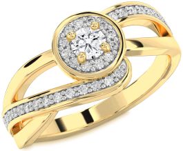 This Promise ring features a dazzling round-cut center diamond encircled by a brilliant halo of smaller diamonds, creating a radiant focal point. The unique split shank design, adorned with two parallel rows of pavé-set diamonds, adds depth and dimension. Crafted in luxurious yellow gold, it’s a captivating symbol of enduring commitment and heartfelt promises.