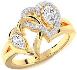 This exquisite promise ring showcases two pear-shaped gemstones—one radiant pink and the other deep red—nestled within intertwining heart frames. The upper heart is lavishly accented with a halo of sparkling white diamonds, adding brilliance and depth. Set in warm yellow gold, this promise ring is a striking symbol of love, passion, and enduring devotion.