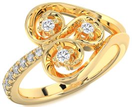 This radiant promise ring features a unique swirl design with three gemstone-accented centers—each representing love, unity, and individuality. Set in polished yellow gold, the trio includes a deep red, rich green, and brilliant white stone. A cascade of sparkling white stones trails along one side of the band, adding elegance to this expressive piece.