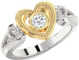 This Promise ring showcases a dazzling round white gemstone cradled within a heart-shaped frame, accentuated by intricate gold bead detailing. Flanked by two smaller open heart motifs, the polished yellow gold band enhances its romantic charm. Symbolizing lasting affection and devotion, this heartfelt design is a timeless expression of commitment and love.