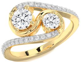 This graceful Promise ring showcases two brilliant round gemstones—one icy blue and the other sparkling white—set in a modern bypass design. The fluid wave of 14K yellow gold is accented by rows of dazzling white diamonds, creating a radiant frame around the center stones. With its intertwining bands and shimmering details, this ring symbolizes a lasting bond and a heartfelt commitment.