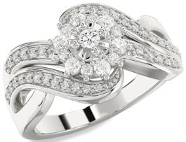 This Promise ring features an elaborate floral centerpiece, radiating elegance with a cluster of brilliant round diamonds arranged in a blossoming pattern. Set in warm yellow gold, the band showcases a graceful wave design adorned with pavé-set diamonds. The intertwining shank adds dimension and sparkle, symbolizing the beauty and commitment of a lasting promise.