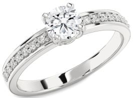 Timeless and radiant, this engagement ring blends classic charm with refined brilliance. A stunning center stone is set high, framed by a band accented with a row of glittering stones that extend down both sides in perfect symmetry. The clean lines and graceful sparkle make this ring a beautiful testament to enduring love and commitment, designed to shine for a lifetime.