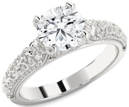 This romantic engagement ring blends floral inspiration with timeless craftsmanship. A dazzling center stone sits proudly above a delicately sculpted band, adorned with intricate vines and blossoms in detailed relief. The graceful design and gentle milgrain edges evoke a garden of love, making it a perfect symbol of devotion, nature’s beauty, and a love that flourishes forever.