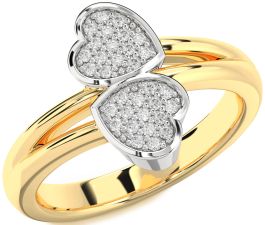 This delightful promise ring showcases two adjoining heart motifs, each beautifully filled with clusters of round brilliant diamonds for a shimmering, textured surface. Set on a sleek, polished yellow gold band that splits at the shoulders, the design creates a graceful flow around the finger. Symbolizing two hearts united, this promise ring is a heartfelt emblem of lasting love and connection.
