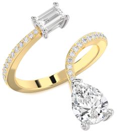This captivating Promise ring features an elegant bypass band in polished yellow gold, adorned with pavé-set diamonds for added brilliance. At each end of the band rests a striking gemstone—an emerald-cut green stone and a pear-shaped white gem—symbolizing balance and connection. A modern yet timeless design, perfect for a meaningful and heartfelt promise.
