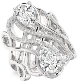 This stunning promise ring features a rich, artistic lattice of polished yellow gold, weaving gracefully beneath two pear-shaped gemstones—one radiant red and one brilliant white. Sparkling pavé diamonds outline the sweeping curves, adding elegance and light-catching brilliance. A truly unique and symbolic promise ring, perfect for celebrating love and commitment in a bold, meaningful way.