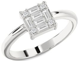 This promise ring exudes classic sophistication with a striking geometric centerpiece composed of vertically set baguette-cut diamonds framed by brilliant round stones. The diamonds are set in a polished square atop a smooth, elegant yellow gold band. With its clean lines and timeless brilliance, this promise ring makes a modern yet sentimental symbol of enduring love and commitment.