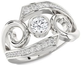 Artful and expressive, this engagement ring features a luminous center stone nestled within a sleek bezel, surrounded by dramatic swirling motifs and angular frames. Accents along the upper and lower curves add brilliance and contrast to the flowing design. A bold celebration of creativity and love, this ring captures passion through movement, sparkle, and distinctive elegance.