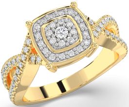 This Promise ring exudes opulence with its ornate cushion-shaped double halo surrounding a dazzling round center stone. A striking mix of clustered diamonds creates a radiant, multi-layered brilliance. The intricately detailed yellow gold band features a twisted pavé design, symbolizing a bond that’s both elegant and everlasting—perfect for a heartfelt commitment.