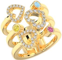 This lively and expressive Promise ring bursts with charm and color, featuring five dazzling heart-shaped outlines adorned with shimmering white stones. Set in radiant yellow gold, it’s accented with vibrant pink, purple, and white gemstones in bezel settings, adding a unique and playful flair. A standout Promise ring, it's perfect for celebrating individuality and joyful commitment.