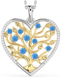 Large Diamond & Swiss Blue Topaz Gold Silver Heart Tree Of Life Necklace