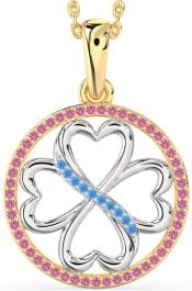 Swiss Blue Topaz & Pink Sapphire Platinum & Yellow Gold Clover Circle Necklace