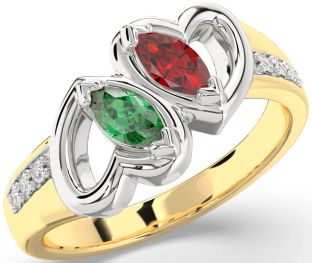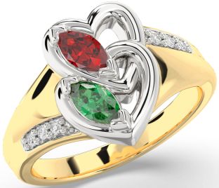 White & Yellow Gold Emerald and Ruby Heart and Interlock Rings Jul Ruby