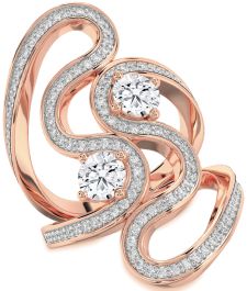 This exquisite promise ring features a breathtaking swirl design in gleaming yellow gold, elegantly paved with shimmering accent diamonds throughout. Two prominent round stones—one icy blue and the other clear—are securely held in classic four-prong settings at the heart of the sweeping curves. A graceful and artistic expression of lasting commitment, this promise ring radiates beauty and romance.