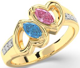This charming gold Promise ring showcases two marquise-cut gemstones—one radiant pink and the other passionate red—cradled within open heart-shaped frames. Set side by side in a mirror-like embrace, they symbolize love and connection. A row of glistening round diamonds on each shoulder adds a touch of brilliance, creating a design that's romantic, elegant, and deeply meaningful.
