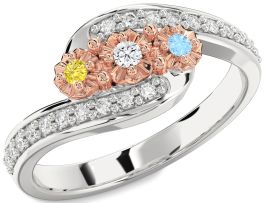 This Mother's ring blossoms with three starburst floral motifs, each cradling a birthstone that represents a cherished loved one. The sparkling band gently curves like a loving embrace, symbolizing a mother’s protective spirit and unwavering devotion. Radiant and joyful, this ring celebrates the beauty of motherhood in every shimmering petal and delicate curve.