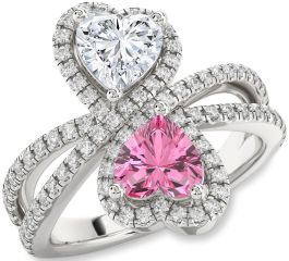 This captivating Promise ring showcases two heart-shaped stones nestled side by side in a romantic embrace, each encircled by a radiant halo of pavé-set gems. The bypass-style band wraps around the hearts with shimmering brilliance, creating a stunning crisscross silhouette. A symbol of deep love and eternal connection, this design balances elegance and passion in a timeless, sparkling statement.