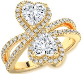 This captivating Promise ring showcases two heart-shaped stones nestled side by side in a romantic embrace, each encircled by a radiant halo of pavé-set gems. The bypass-style band wraps around the hearts with shimmering brilliance, creating a stunning crisscross silhouette. A symbol of deep love and eternal connection, this design balances elegance and passion in a timeless, sparkling statement.