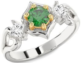 Diamond Emerald Gold Silver Round Three Stone Engagement Ring