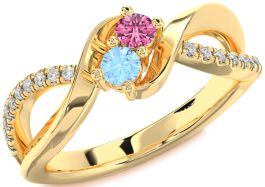 This stunning promise ring features a graceful infinity-style bypass design in radiant yellow gold. At the heart of the ring, two round-cut gems—one soft pink and the other icy blue—are cradled in prong settings, symbolizing unity and enduring love. A line of pavé-set diamonds arcs along the split band, adding brilliance and depth to this meaningful symbol of your everlasting bond.