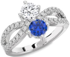 This exquisite promise ring showcases a dazzling duet of round-cut stones—one brilliant white and one deep royal blue—nestled in classic prong settings. Crafted in lustrous yellow gold, the split shank design is adorned with pavé-set diamonds that gracefully loop around the center, creating a captivating symbol of commitment and shared journeys ahead.
