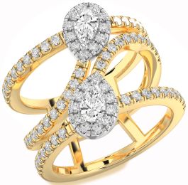 This Promise ring showcases two elegant pear-shaped stones—one icy blue and one brilliant white—each framed by a halo of shimmering diamonds. The bypass-style split shank, encrusted with pavé-set diamonds, adds a dynamic and graceful silhouette. Crafted in radiant yellow gold, this Promise ring represents the perfect harmony of love and commitment.