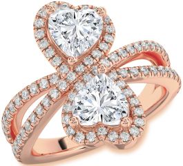 This captivating Promise ring showcases two heart-shaped stones nestled side by side in a romantic embrace, each encircled by a radiant halo of pavé-set gems. The bypass-style band wraps around the hearts with shimmering brilliance, creating a stunning crisscross silhouette. A symbol of deep love and eternal connection, this design balances elegance and passion in a timeless, sparkling statement.